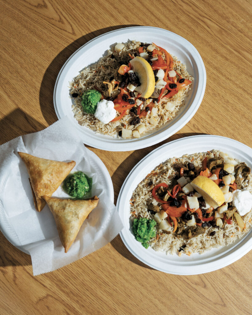 Once you have the chicken or tender bone-in goat with its sweet, earthy flavors, you will not forget it. But don’t wait until the end of the day to get your fix: “Whatever we have, once it’s run out, we’re not gonna start making more,” Aden says. And don’t forget the sambusas – crispy, fried pastry pockets served with a tangy chutney.